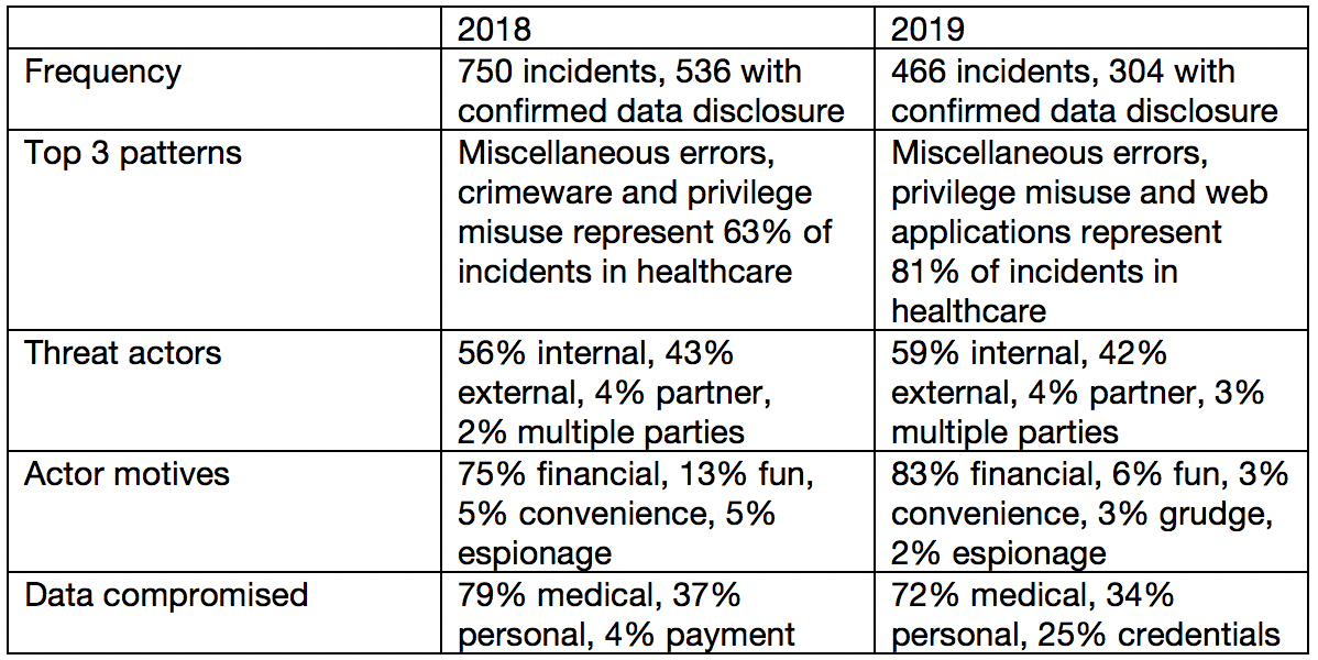 Non sorprende che il rapporto di Verizon non sia cambiato molto dal 2018 al 2019. I risultati per l'assistenza sanitaria sembrano essere quasi identici. Mentre confrontavo i rapporti, dovevo continuamente verificare se stavo guardando i dati del 2018 o del 2019, perché erano molto simili. Ho preso i dati riportati da Verizon per l'assistenza sanitaria nel 2018 e nel 2019 e li ho scomposti in questa tabella per capire le variazioni.